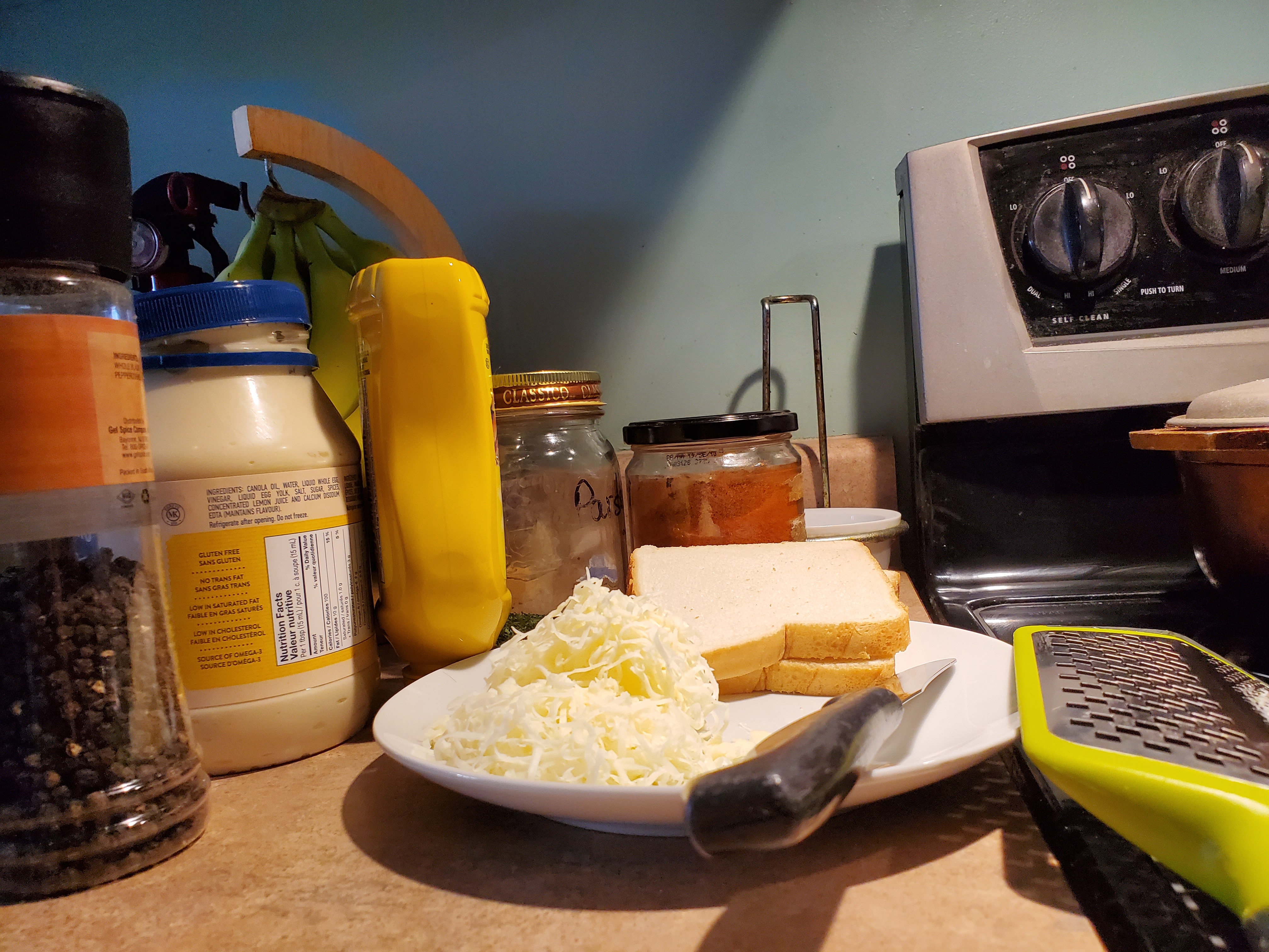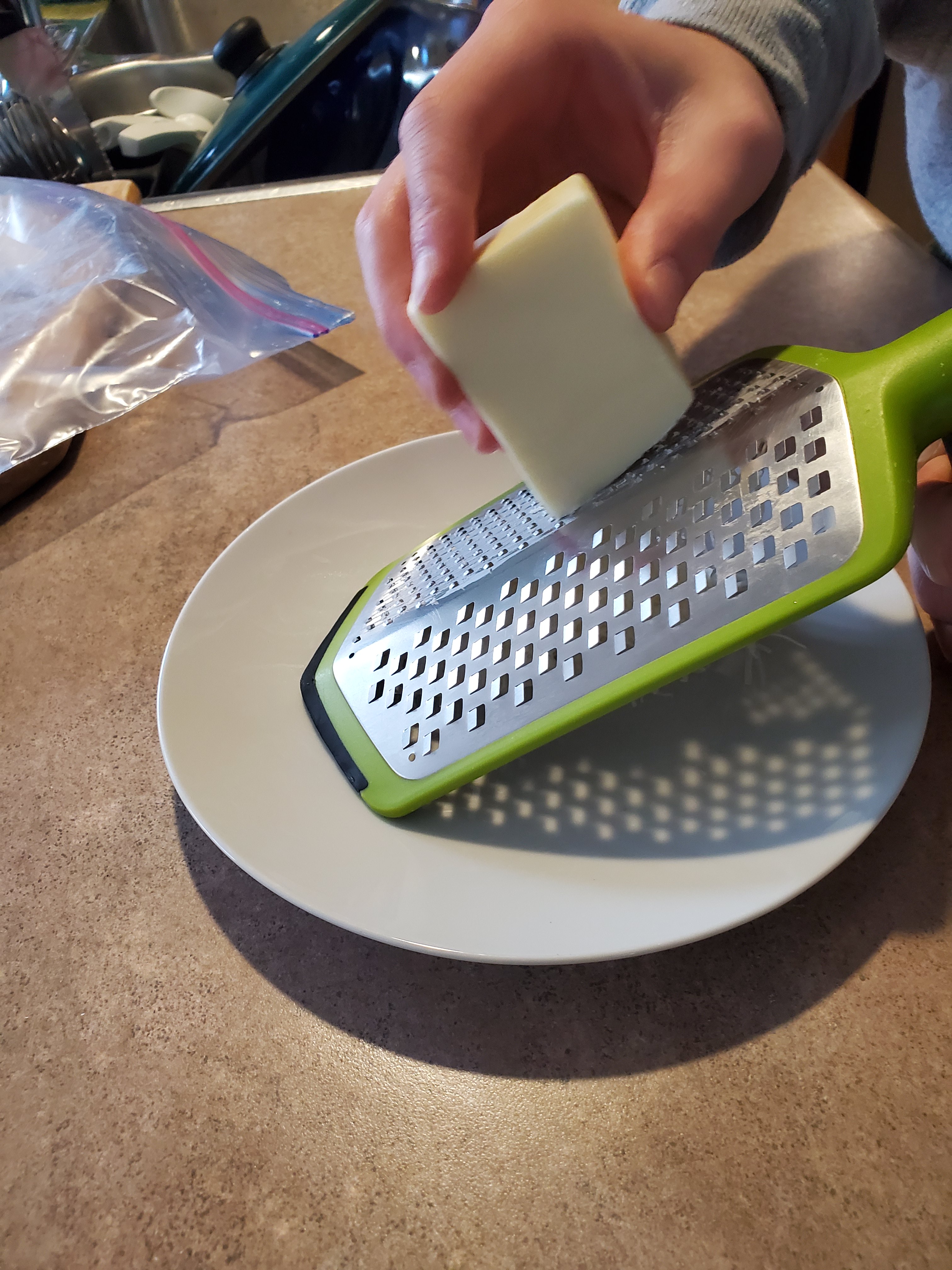 While my macaroni is boiling, I whisk together an egg, about a cup of milk salt and black pepper and I shred my cheese. I want to get a real cheddary flavour because there is no point in a bland macaroni pie. I use anything from 2 to 4 year old cheddar from Mapledale, found here in my neck of the woods and i also use a little 2 year old smoked cheddar to well, add a little smokiness to the taste but if I don’t have it, I just use the old cheddar. I have smoked cheese today so I will use both.