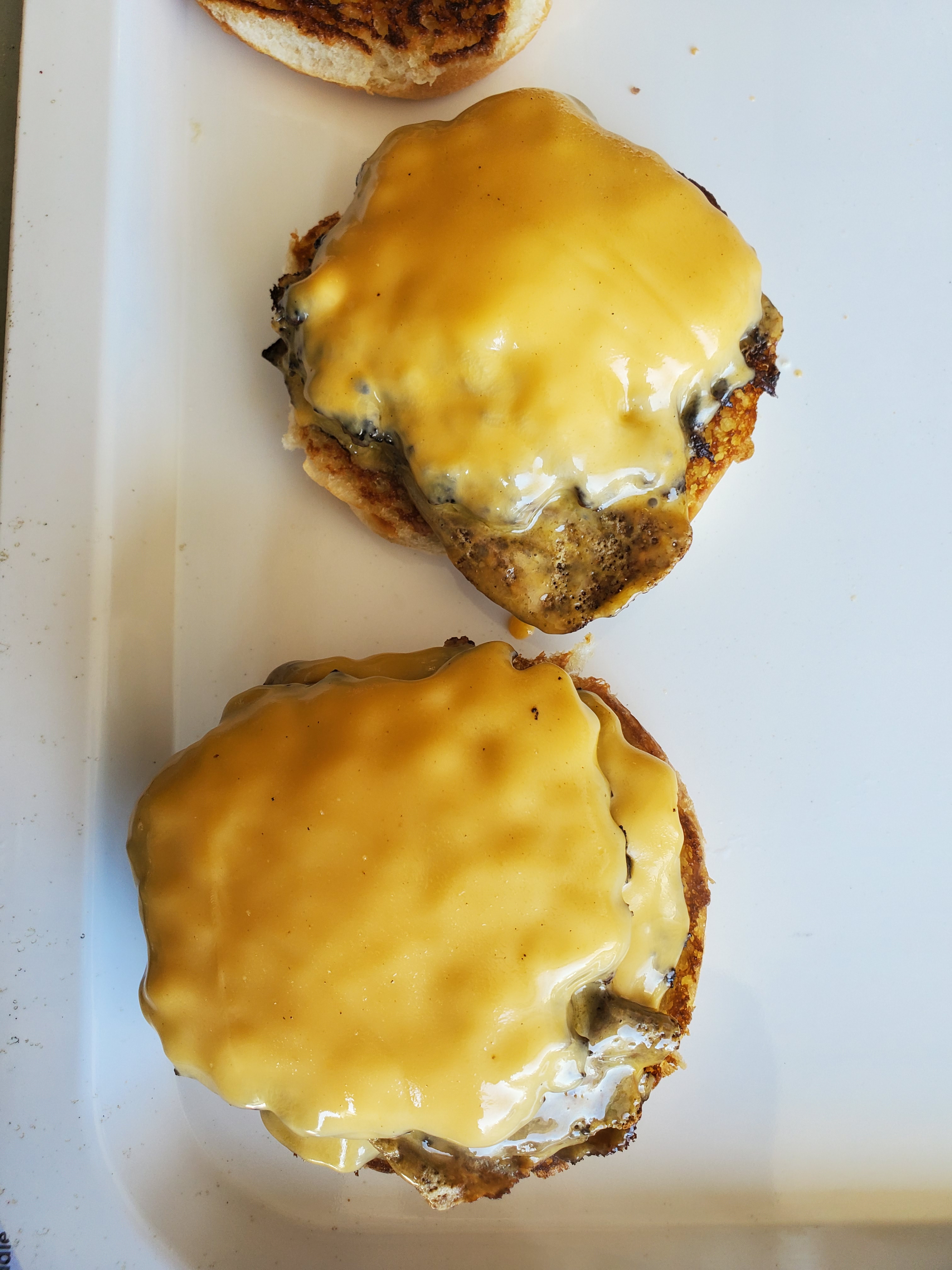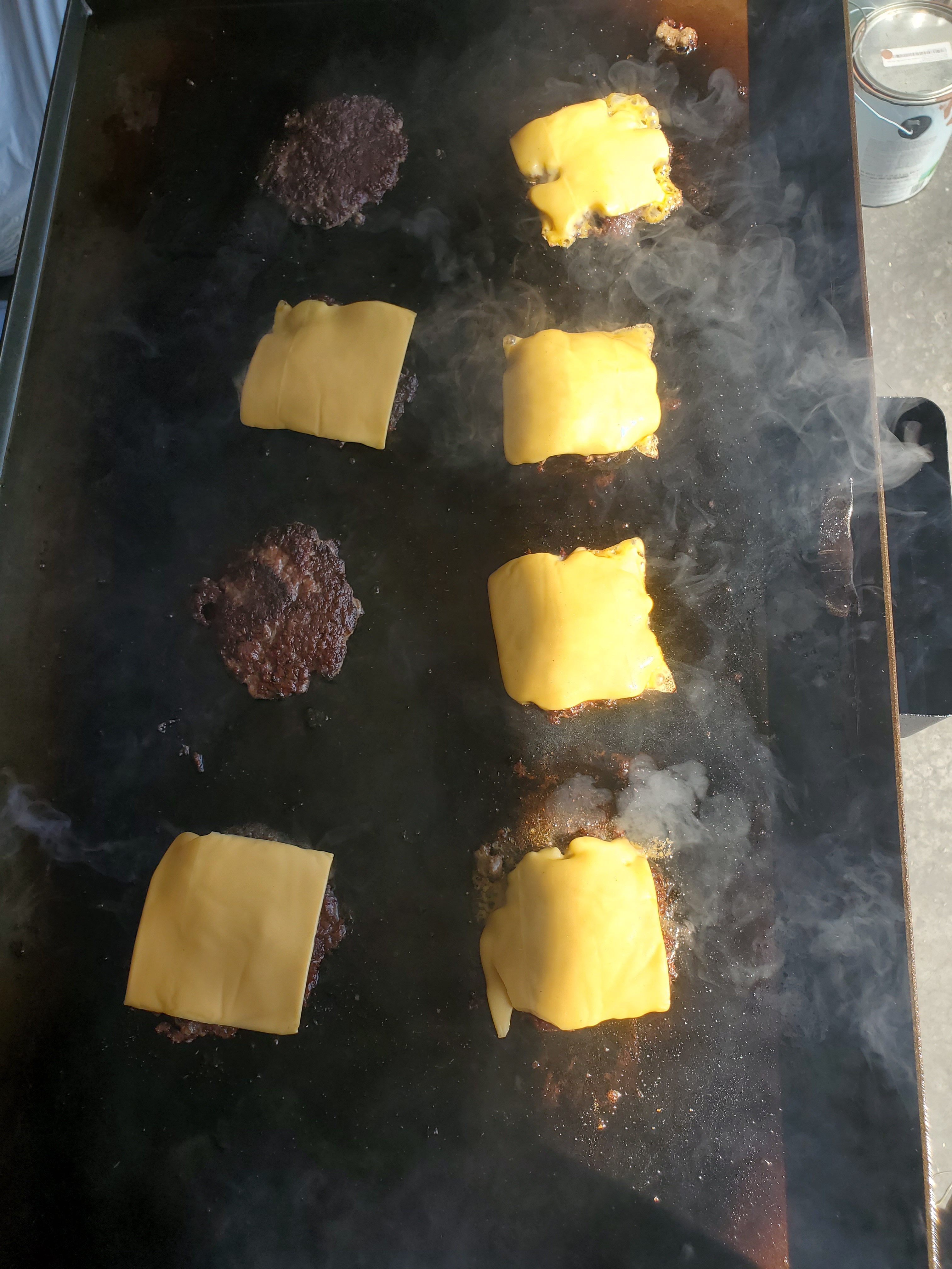 Add salt and pepper and let continue to cook for another 30 secsonds. Look at the juiciness of the burger and the crust that forms on the surface that traps the flavor in the meat. Flip the burger and cook the other side for about a minute. The grill is hot and the meat is pressed thin so it will cook fast so be careful not to over cook or burn. Top with cheese and allow to melt.