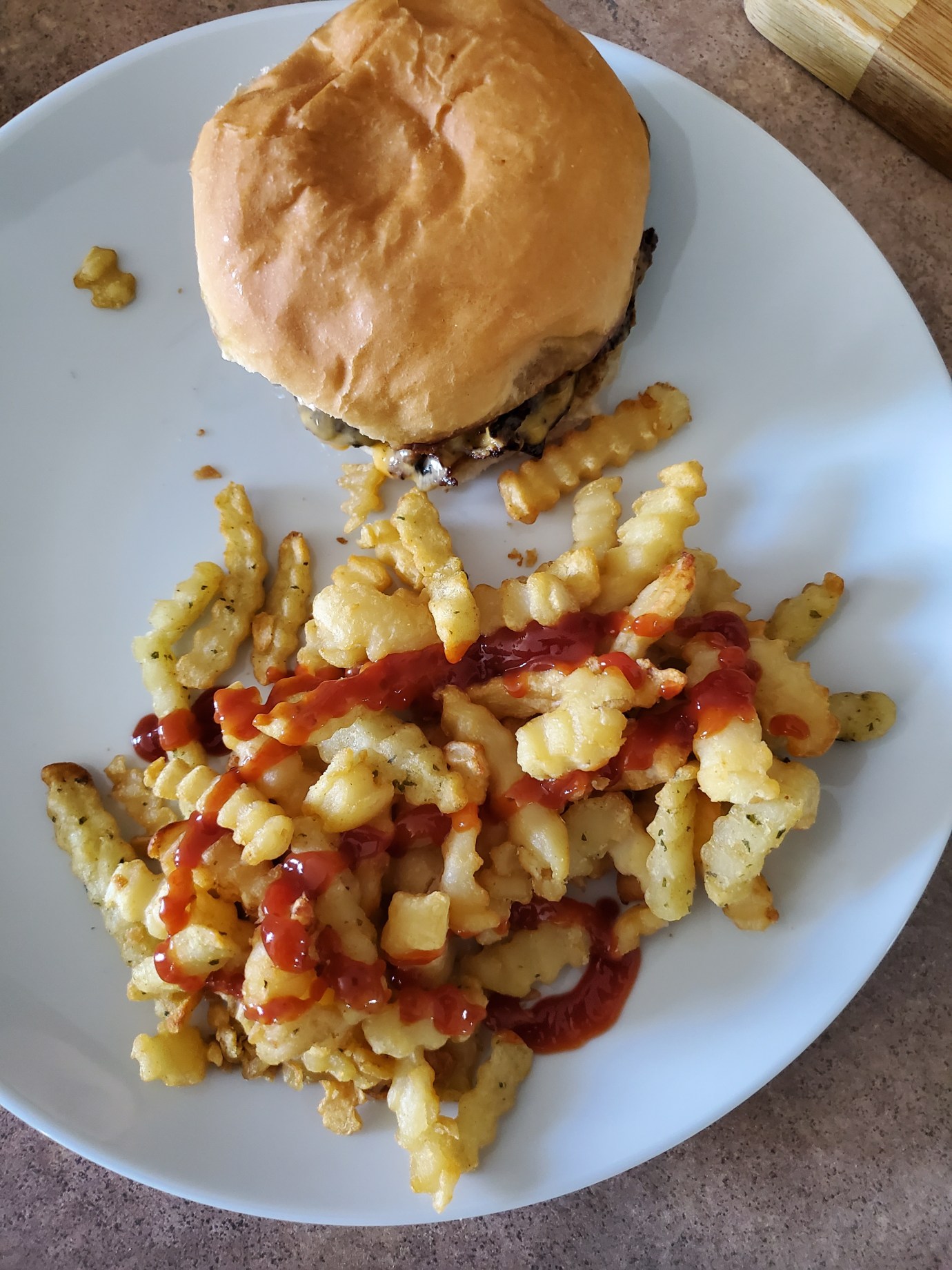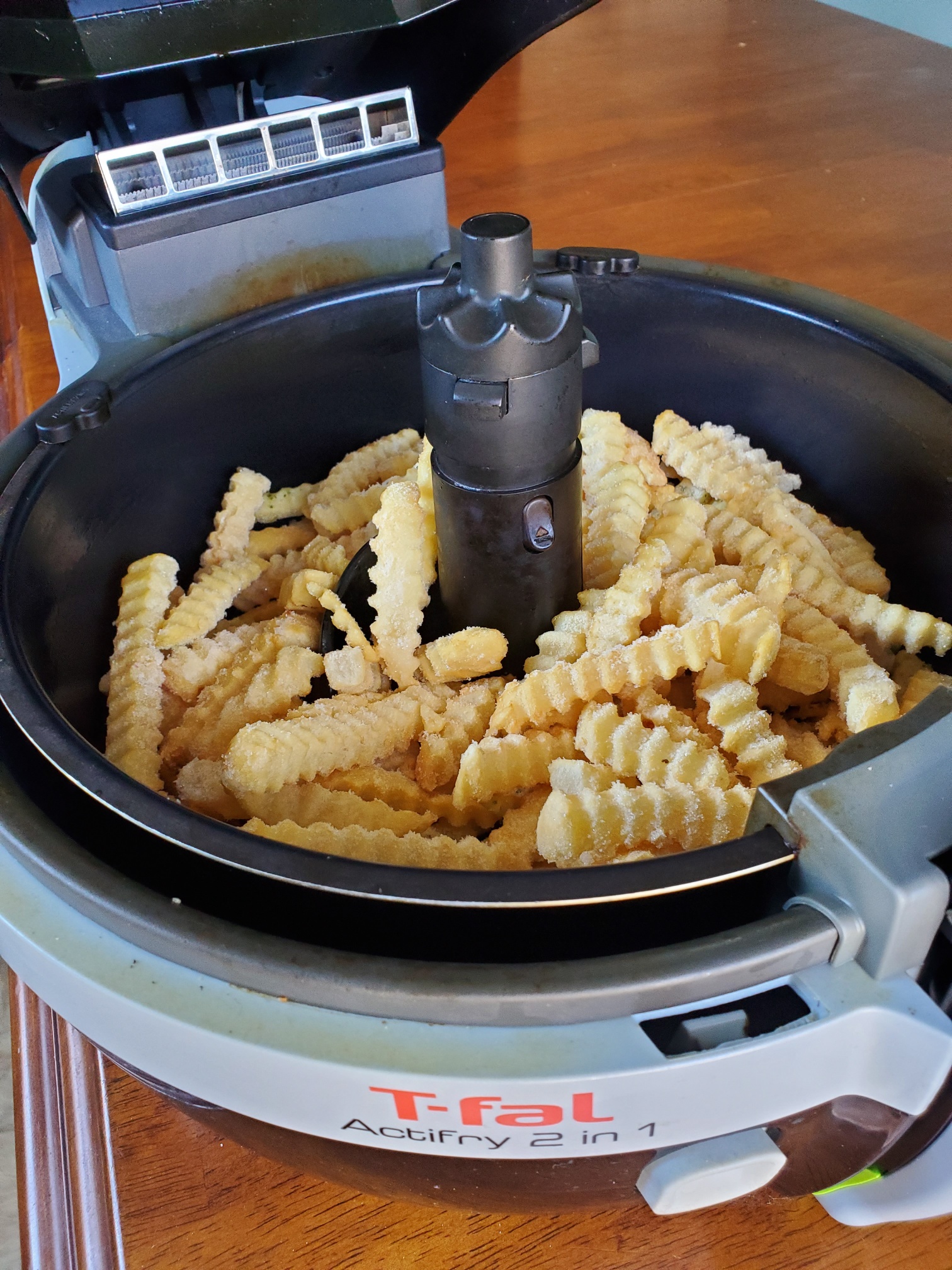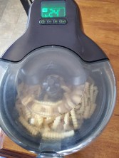Mix a bit of ketchup, mustard, relish and mayonnaise and set aside to spread onto the burger buns later. Tom makes a jar of sauce. He stores in it the fridge in a small, sanitized former Smuckers jam jar for future burger use. As with anything in cooking keep adding the ingredients gradually, mixing them and tasting to ensure good flavor. Oh, another thing to remember, if you are serving fries with your meal, you have to decide how to time that out so that they are ready to be served with your burgers. We use a Tefal Air “Fryer” that takes about 25 minutes to make the fries. We also don’t use the recommended table spoon of oil when cooking with it as you really don’t need to. The surface of the pan is non stick, easy to clean and it can cook anything from fries to chicken and anything you would ordinarily fry in oil. It can even cook vegetables if you want it to. By not needing oil you get healthier prepared fries that are just as tasty and crispy as those fried in oil.