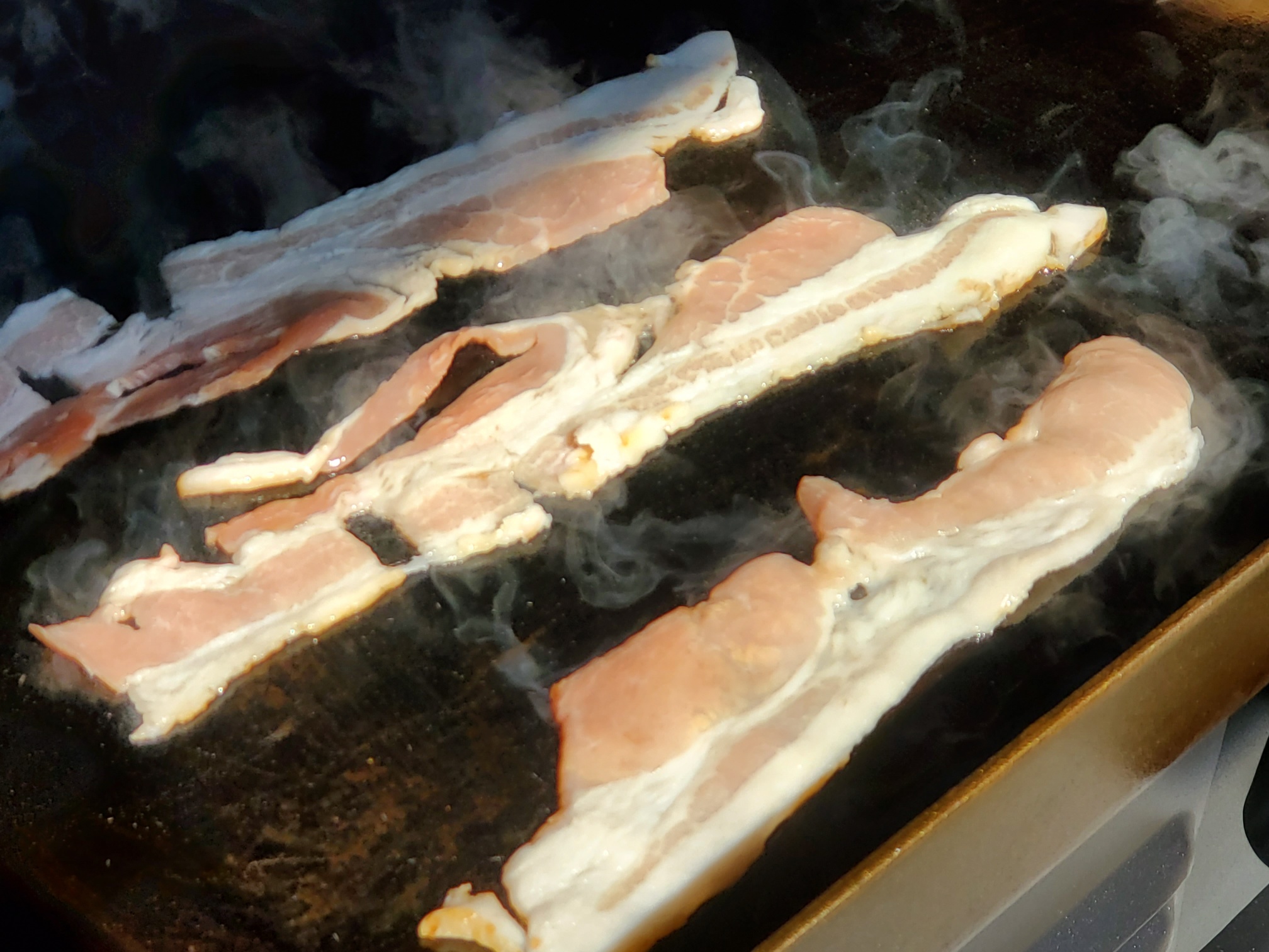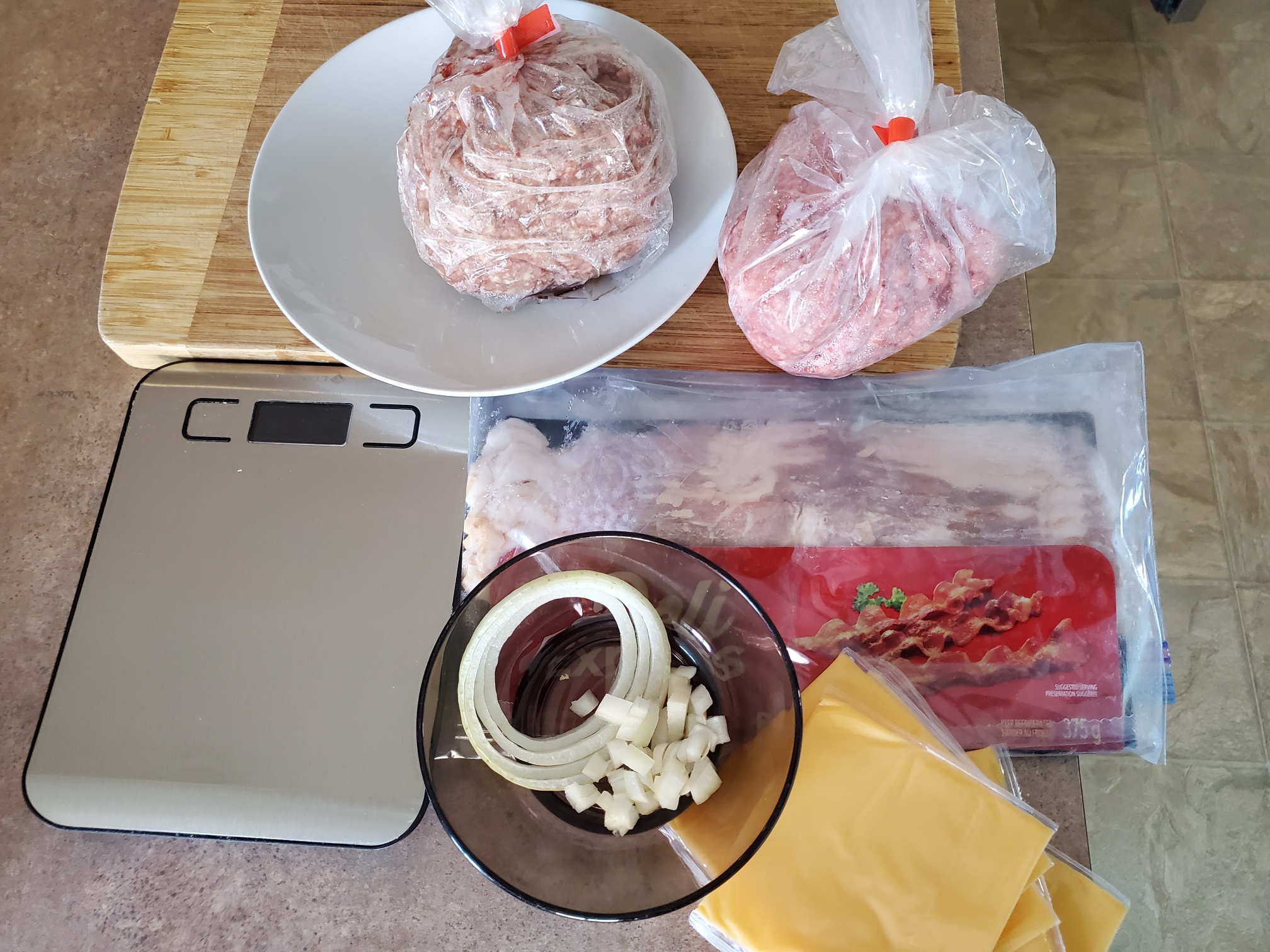 To make smash burgers, you need regular sized hamburger buns because you don’t excess bread that will fill you up too quickly and prevent you from thoroughly enjoying every crumb of this burger. You will need 8 strips of lean bacon and about a pound and a quarter of medium ground beef (Tom uses a scale as he is a more precise cook than I am).