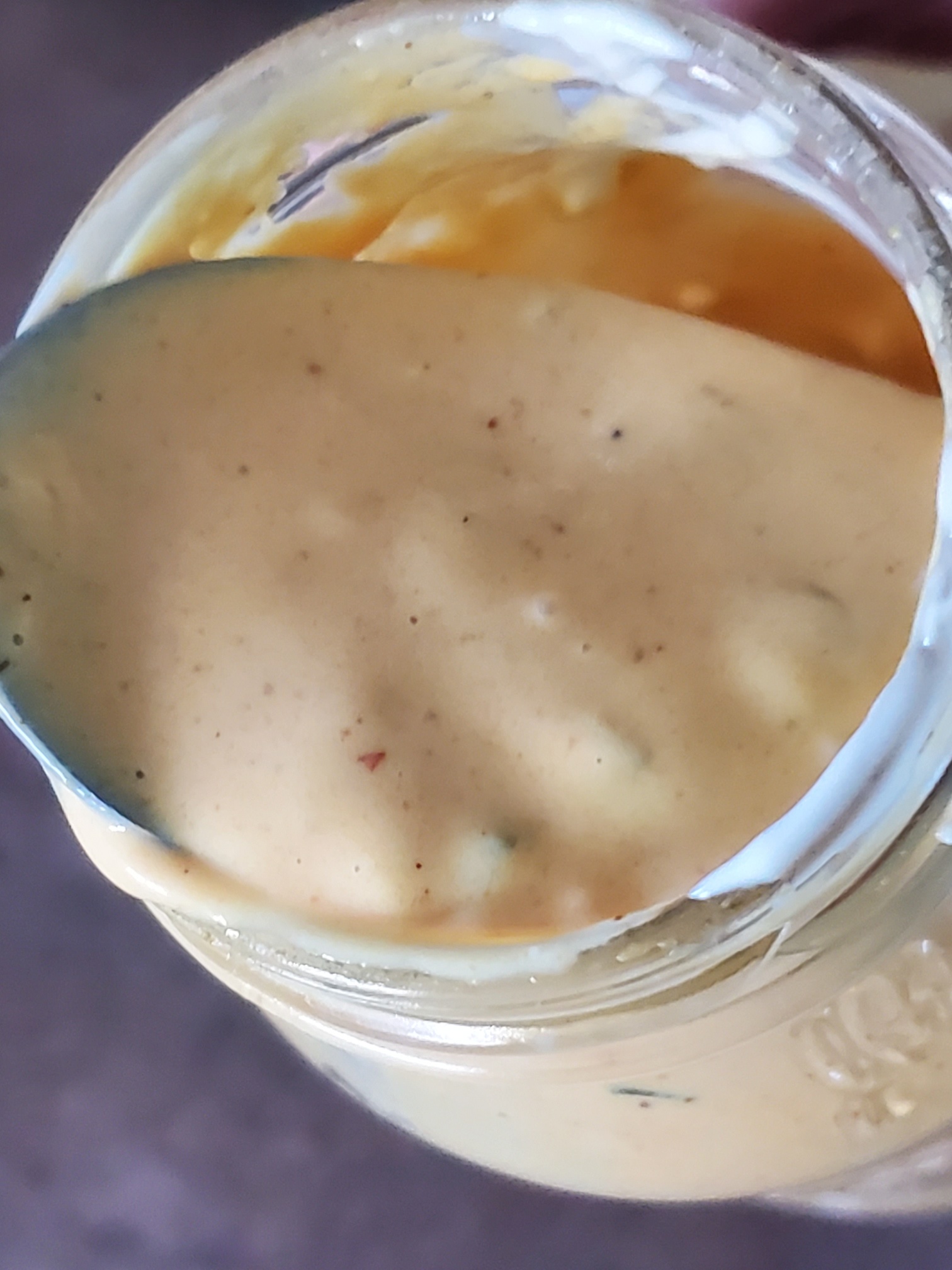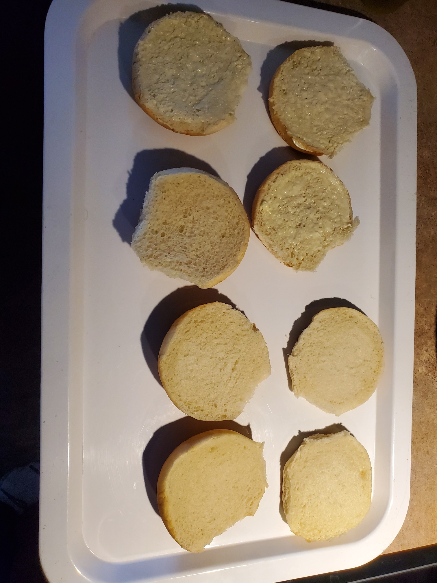 Meanwhile in the kitchen, I spread the burger sauce on the buns.