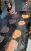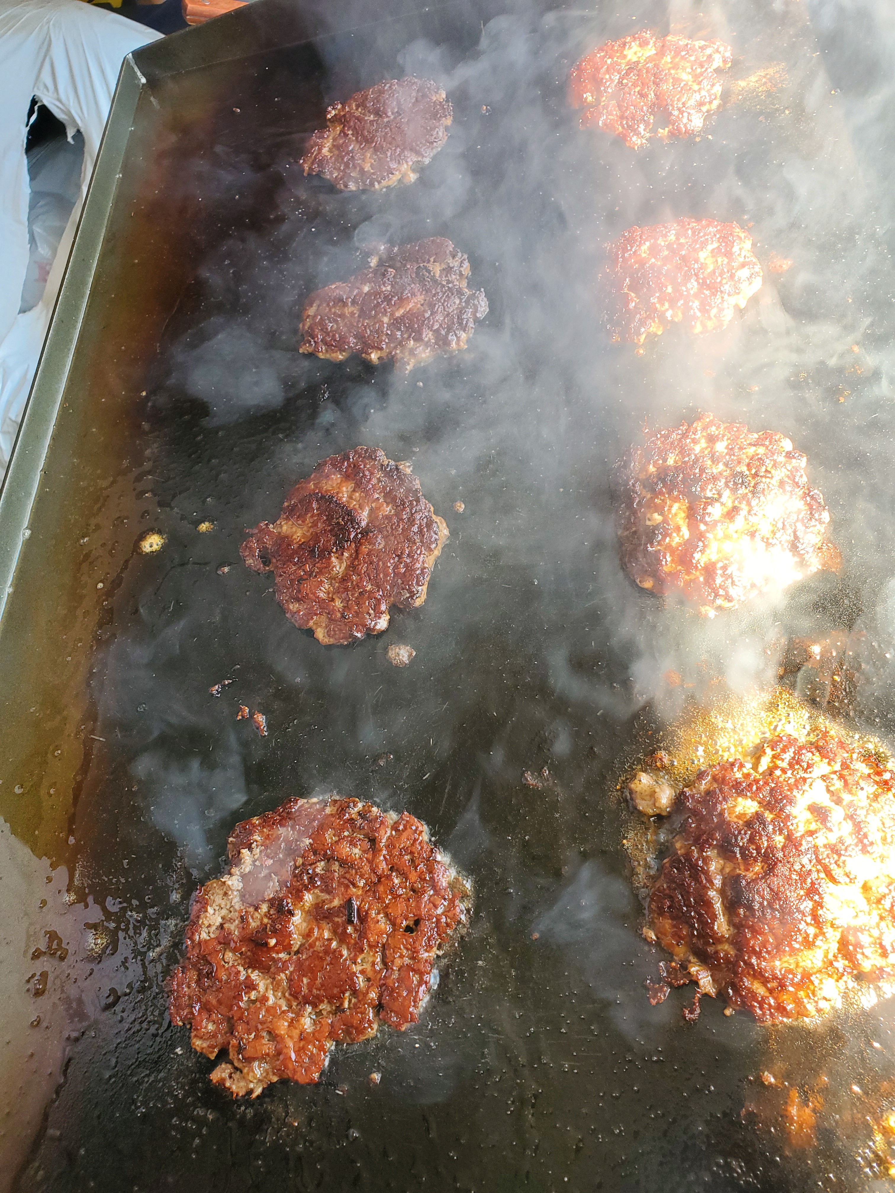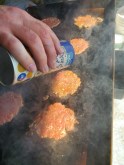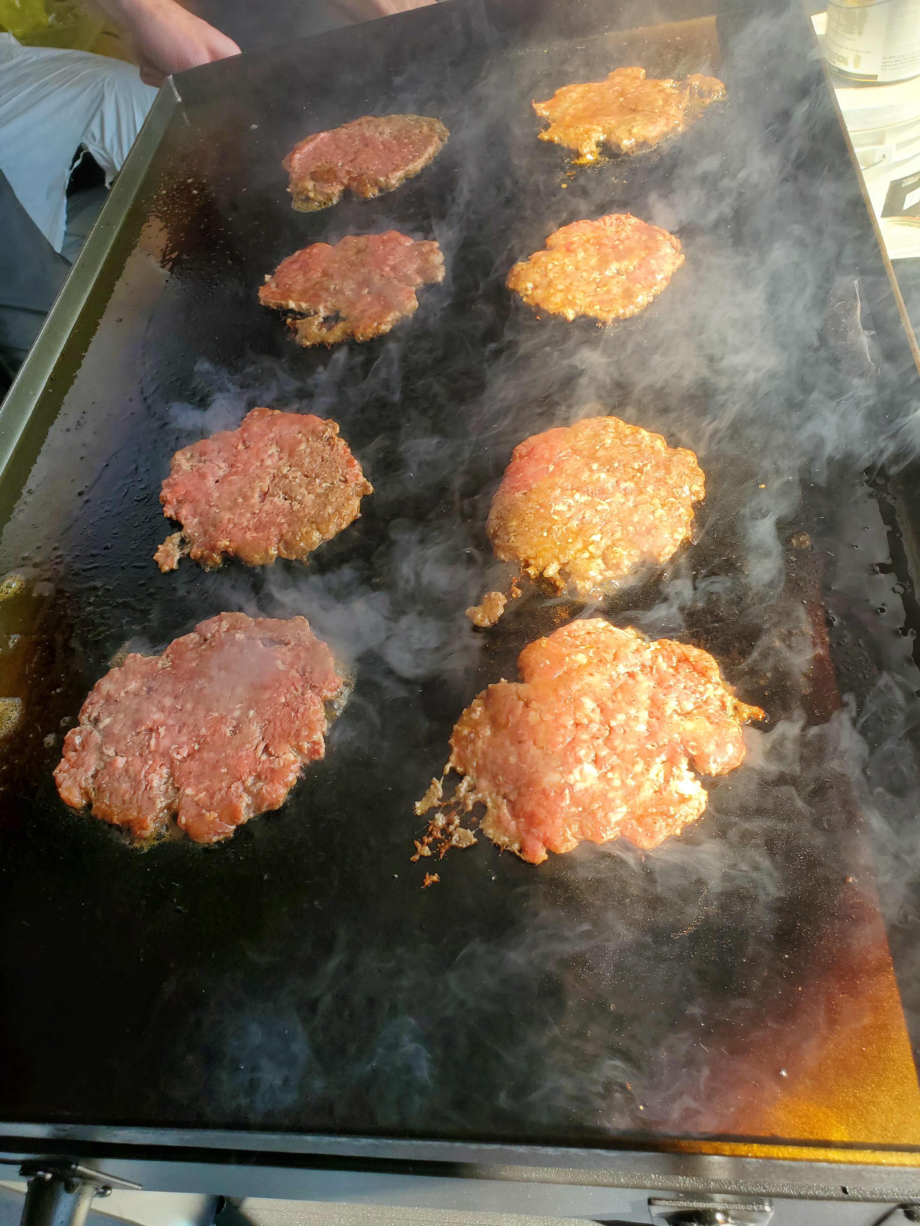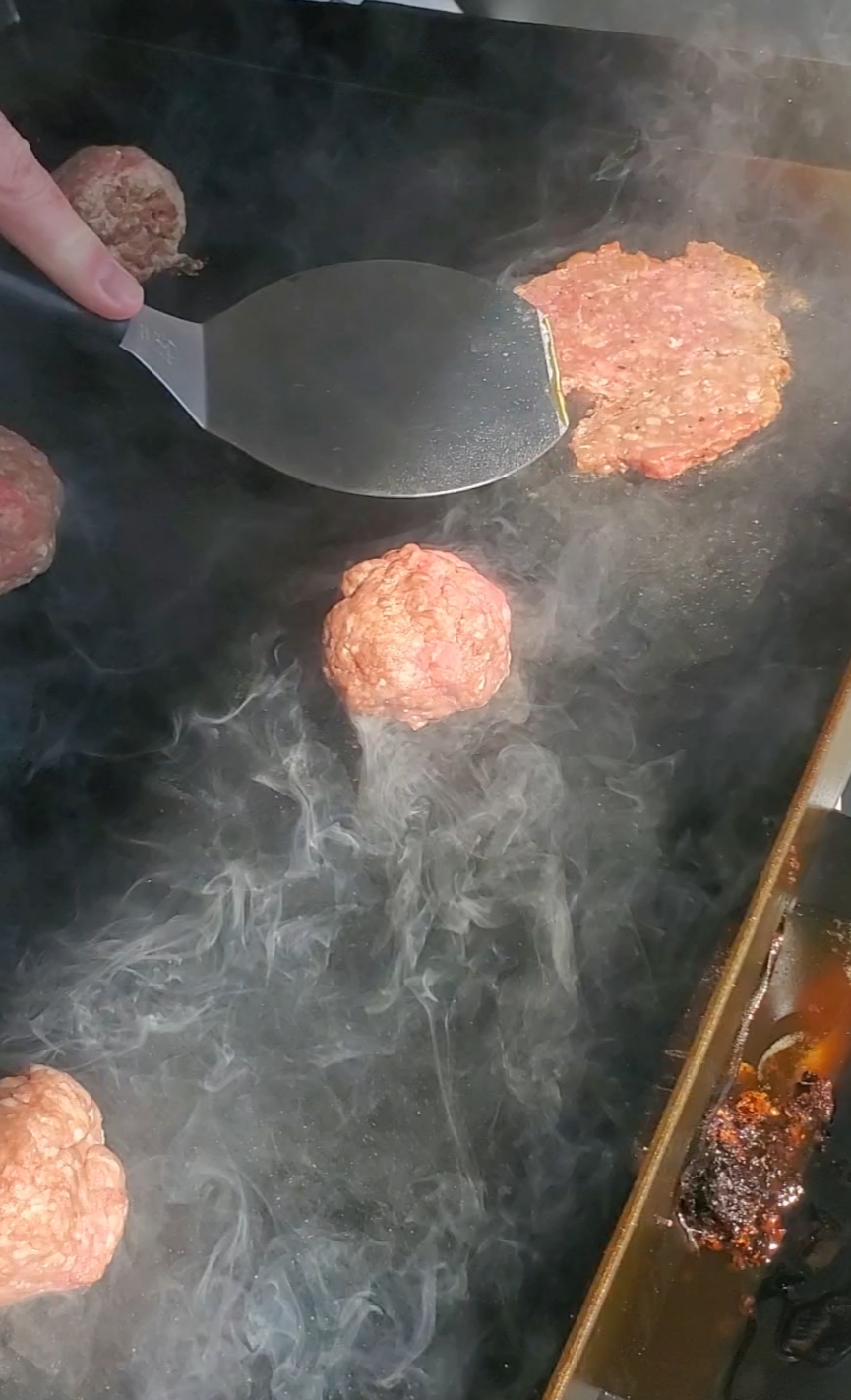 The heat is equalized across the grill and the meat balls are equally spread across the surface. After they sear for about 20 seconds, the balls are ready to be smashed (he he he).