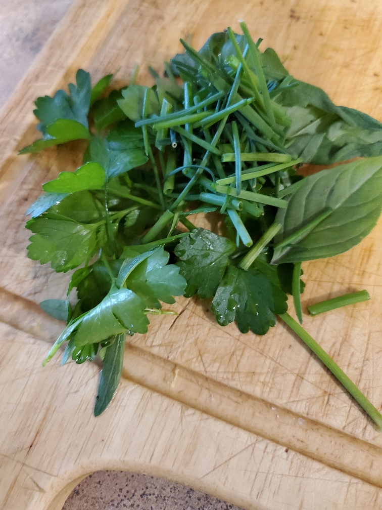 1/2 cup combination of chopped coriander,chives, garlic, thyme, parsley, cilantro and taragon.